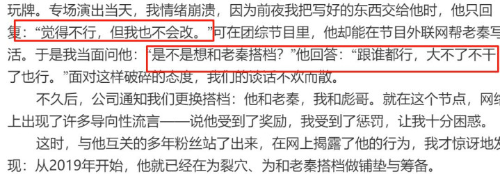 帮小秦写段子那份用心劲儿,日常照料的那份细致劲,连帮忙洗内裤这种私密事都传出来了,在台上还能瞧见跪谢,对比实在太鲜明。