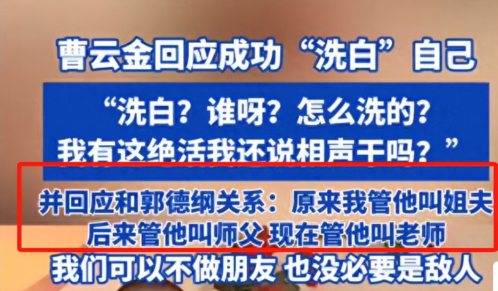 曹云金挺平静地梳理了两人关系的变迁:最早沾亲带故叫过“姐夫”;后来正式拜了师,改口叫“师傅”;直到彻底闹掰分家,现在见面只剩下客气的“老师”。