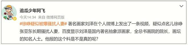8月6日,知名画家爆料刘泽发布了一则视频,称有人爆料“光头笑星”徐峥和张亚东长期骚扰人妻。随后多位娱记也转发了这则视频,证实爆料的明星确实是徐峥和张亚东。