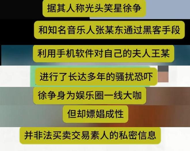视频中称徐峥和张亚东通过黑客手段,非法买卖交易素人的私密信息,并长期对自己的夫人王某进行了长达多年的骚扰和恐吓,同时称徐峥作为娱乐圈一线大咖却嫖娼成性。