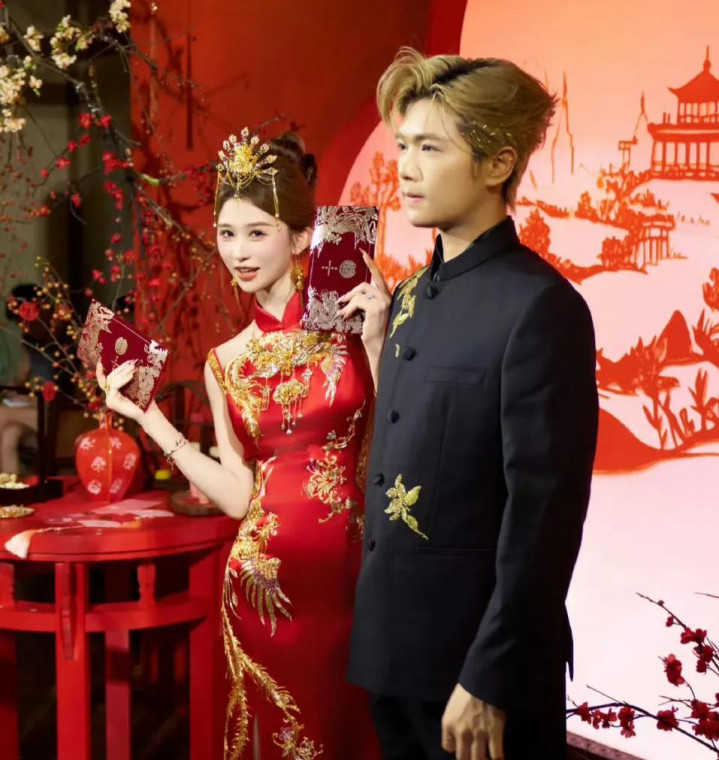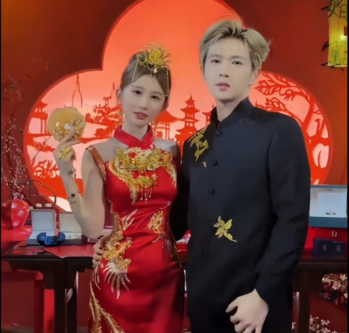 视频中,凌达乐身着笔挺西装,帅气依旧,“兔兔” 一袭洁白婚纱,美丽动人,订婚现场布置得浪漫温馨,中式礼服、红灯笼、大金镯子等元素展现出别样的韵味。