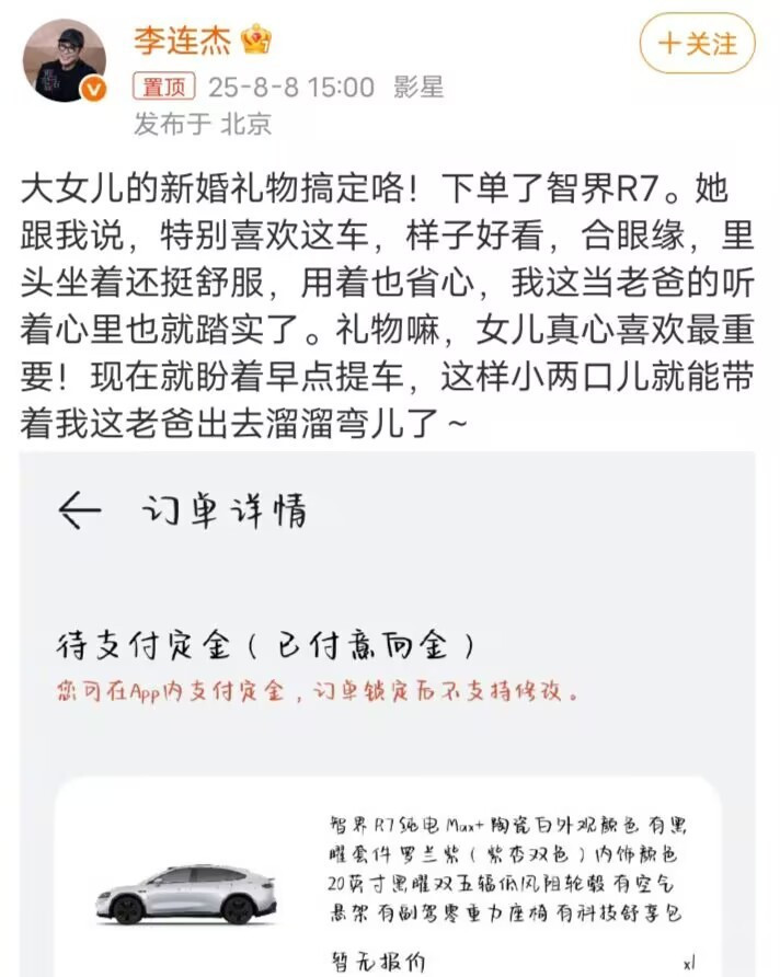 新能源车市场现在白热化,李连杰的送车行为无意中给智界打了个有力助推。难怪车企CEO要发声感谢,这种免费宣传可遇不可求啊。