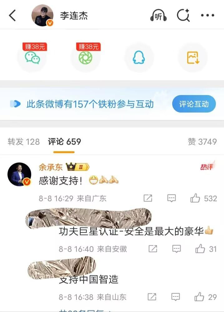 余承东火速在评论区回应,这操作太懂营销套路了。华为需要流量明星带货,李连杰粉丝多,一箭双雕。难怪网友笑称:“李连杰这次是人形宣传页,但咱不讨厌!”