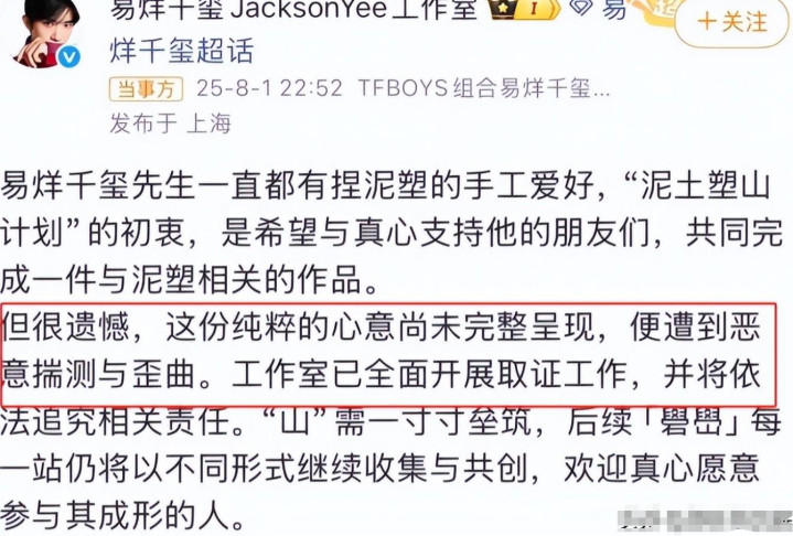 原来易烊千玺前几年就迷上了泥塑,让粉丝带家乡的土,纯粹是想把全国各地的泥土混在一块儿,做个有纪念意义的雕塑。