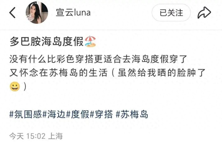 潘玮柏妻子宣云的一组度假照又引发热议了。8 月 18 日她在社交平台分享苏梅岛游记,配文说 "没有什么比彩色穿搭更适合海岛了",碧海蓝天间的亮眼造型本是道美景,网友却盯着一个细节讨论不停:她的短裤没系扣。