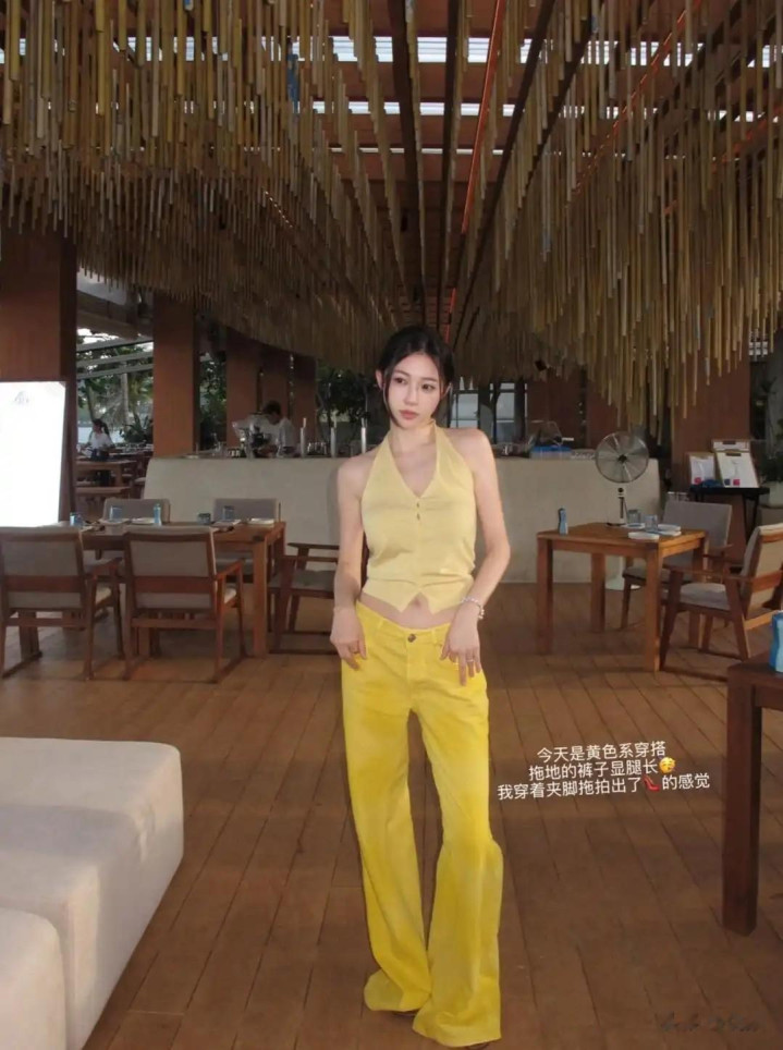 这组 "彩虹穿搭" 把海岛氛围拿捏得死死的。黄色 V 领背心配同色系高腰拖地裤,裤脚扫过沙滩时,视觉腿长直接飙到一米八。