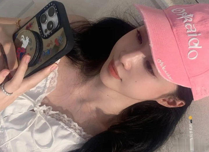 粉色遮阳帽搭白背心加粉阔腿裤,甜得像刚剥壳的荔枝,衬得皮肤白到发光;蓝色长裙配宽檐草帽站在海边,风一吹裙摆翻飞,活脱脱 "人在画中游"。