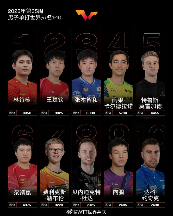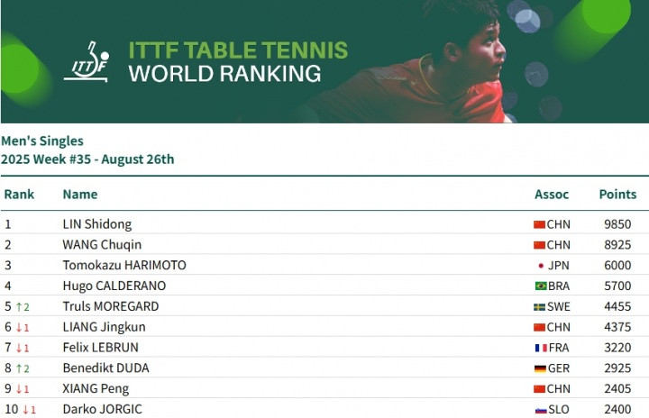 直播吧08月26日讯国际乒联公布2025年第35周男单世界排名,瑞典大满贯击败林诗栋夺冠的莫雷加德上升2位至世界第5。