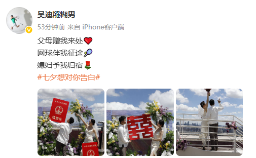 8月28日,中国国家男子网球队员吴迪在社交平台发文官宣结婚。