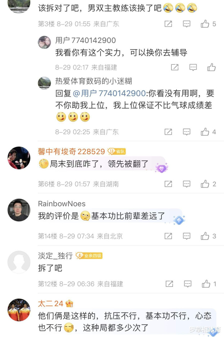 还有不少网友评论:“拆对吧!成绩不会比这更差了!”“这对组合已经失去了昔日的霸气和积极性,基本功比前辈差远了。”“男双主教练该换了。”除男双之外,中国队在其他几个单项也面临着不小争冠压力。石宇奇和翁泓阳将在男单1/4决赛同室操戈,只有一人能够晋级四强。女单仅剩陈雨菲和韩悦,陈柏阳和刘毅成为男双独苗,刘圣书和谭宁、贾一凡和张殊贤也将上演内战。