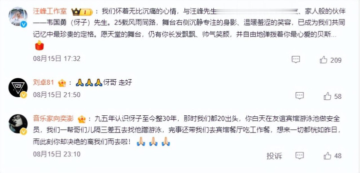 汪峰工作室也紧随其后发布了悼念声明,表达了对韦国勇的沉痛哀悼,声明中提到:25 年的风雨同舟,舞台右侧那个沉静专注的身影、温暖羞涩的笑容,早已成为大家共同记忆中最珍贵的画面,愿天堂的舞台上,韦国勇依然能够长发飘飘,带着帅气的笑颜,自由地弹奏着他最心爱的贝斯。