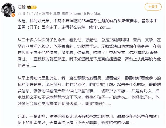 8 月 15 日,汪峰发文透露:陪伴自己长达 25 年的贝斯手韦国勇(伢子)因病离世,这一消息瞬间引发网友热议,大家纷纷感叹生命的无常与脆弱。