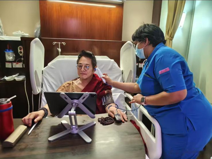 虽然刚做了手术,李连杰还是心系工作,毕竟现在他的自媒体账号才刚刚做起来,有很多事都要向团队交代,于是刚刚能坐起来他就紧锣密鼓地和团队开会,手指上胳膊上还戴着监护仪,护士也一直在旁边监控他的身体状况。