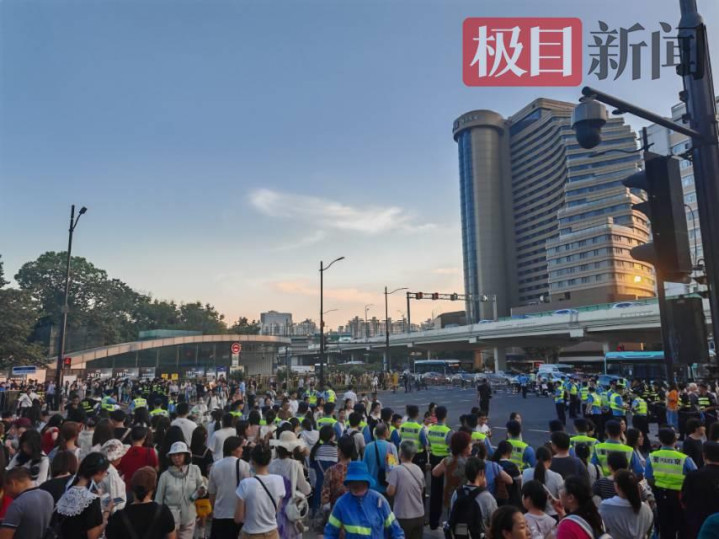 “请注意脚下安全”“这边不能停留,请快速通行”……路上每隔几米便有安保人员引导分流,现场采取“人工红绿灯”模式,由安保人员组成移动人墙,在路口处交替放行观众和过路市民。