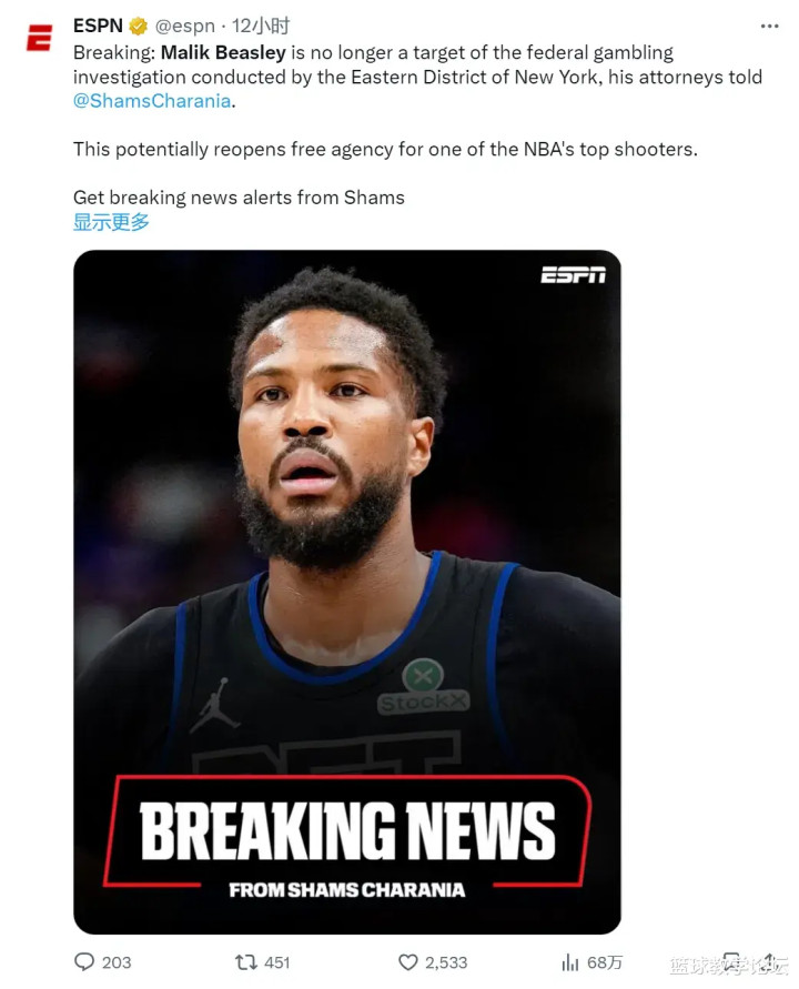 北京时间8月23日,NBA名记Shams报道,马利克-比斯利的律师透露,针对比斯利的调查已经结束,他没有受到赌球指控,这位顶级射手将进入自由市场。律师表示:“比斯利没被起诉,也不是此次调查的目标,本不该对他造成如此灾难性的后果。”