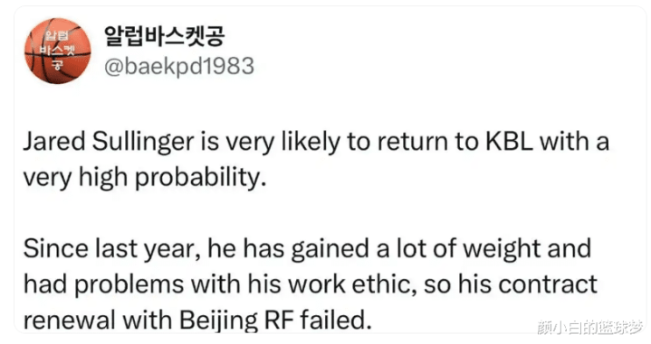 今年6月有消息传萨林杰可能要转投韩国KBL联赛,有韩国博主就指出萨林杰因为不自律导致体重大幅增加,他的体能问题也变得愈发严重起来。
