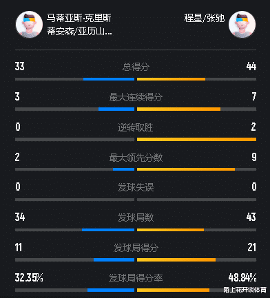 由于马蒂亚斯刚刚解禁复出不久,因此他本赛季和博尔一起搭档征战混双的场次并不多,不过二人的实力不容小觑,赛季首次参加国际大赛就拿到了中国澳门公开赛的冠军,尽管程星/张弛世界排名第12远高于对手,但绝对不能掉以轻心。