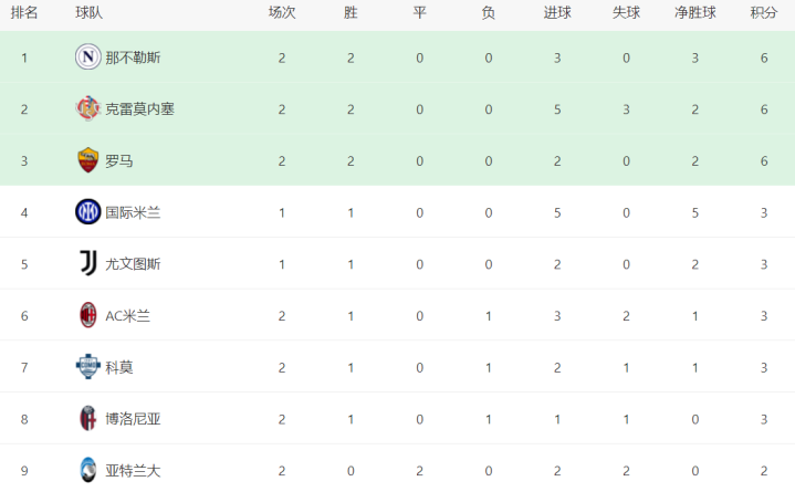 在积分榜上,那不勒斯以6分排名榜首。克雷莫内塞和罗马也都是6分,但净胜球比那不勒斯少1个,只能排在那不勒斯身后。国际米兰、尤文图斯、AC米兰、科莫和博洛尼亚都是3个积分。不过,国际米兰和尤文图斯都只踢了1轮联赛。