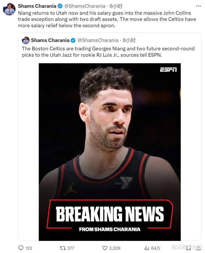 凯尔特人成功送走霍勒迪跟波尔津吉斯,工资+奢侈税一共省了2.5亿美元,而且没有搭上选秀权。如今又把尼昂送走,虽然搭上2个次轮签,但是又省了5000万美元。别忘了凯尔特人还用底薪签下布歇,上赛季场均10分4.5篮板。
