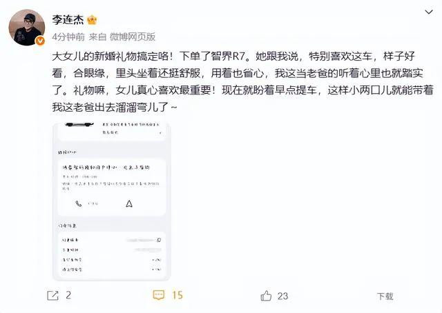 李连杰还特意照顾一句:花了30万,牌子是华为的,很期待能够很快提到新车,这样女儿女婿,就可以拉着自己这个老年人去遛弯了。