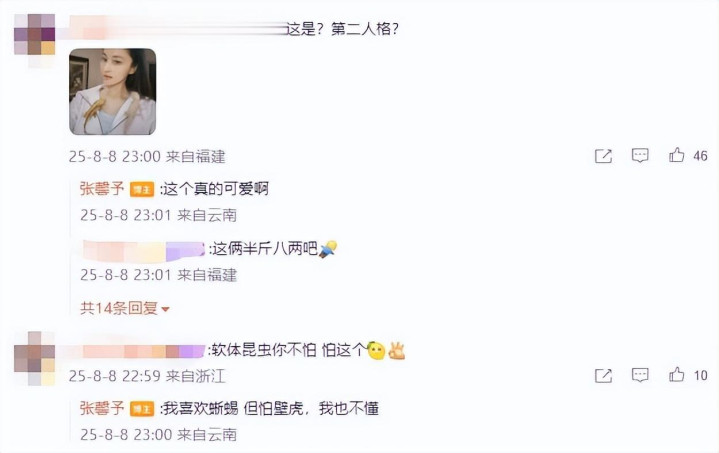 有粉丝看到后晒出张馨予之前和蜥蜴的合照,并笑侃道:“你害怕壁虎?那这是?第二人格?”对此,张馨予表示:“这个(蜥蜴)真的可爱啊!”她说:“我喜欢蜥蜴,但怕壁虎,我也不懂。”
