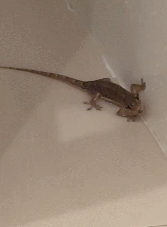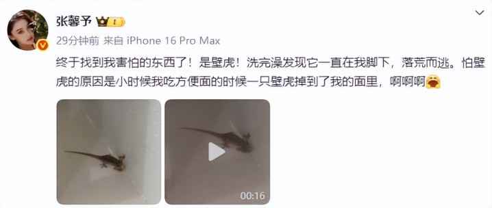 张馨予给浴室里的壁虎拍了视频,一边拍一边说:“我特别怕壁虎!你还舔舌头!”