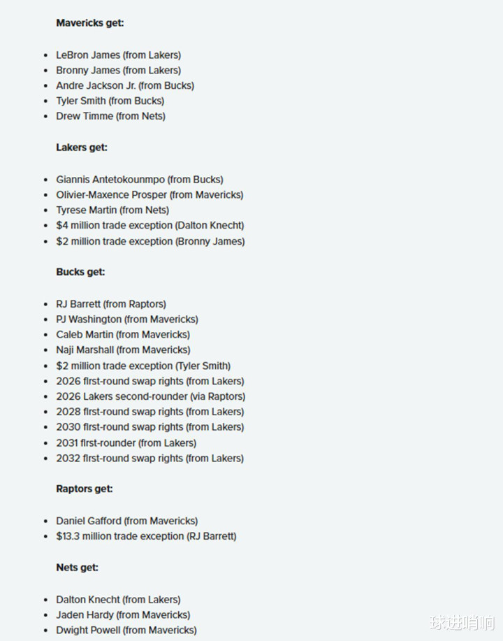 雄鹿得到:巴雷特+PJ华盛顿+凯莱布-马丁+马绍尔+200万交易特例(泰勒史密斯)+26年湖人首轮互换+26年湖人次轮+28年湖人首轮互换+30年湖人首轮互换+31年湖人首轮+32年湖人首轮互换;