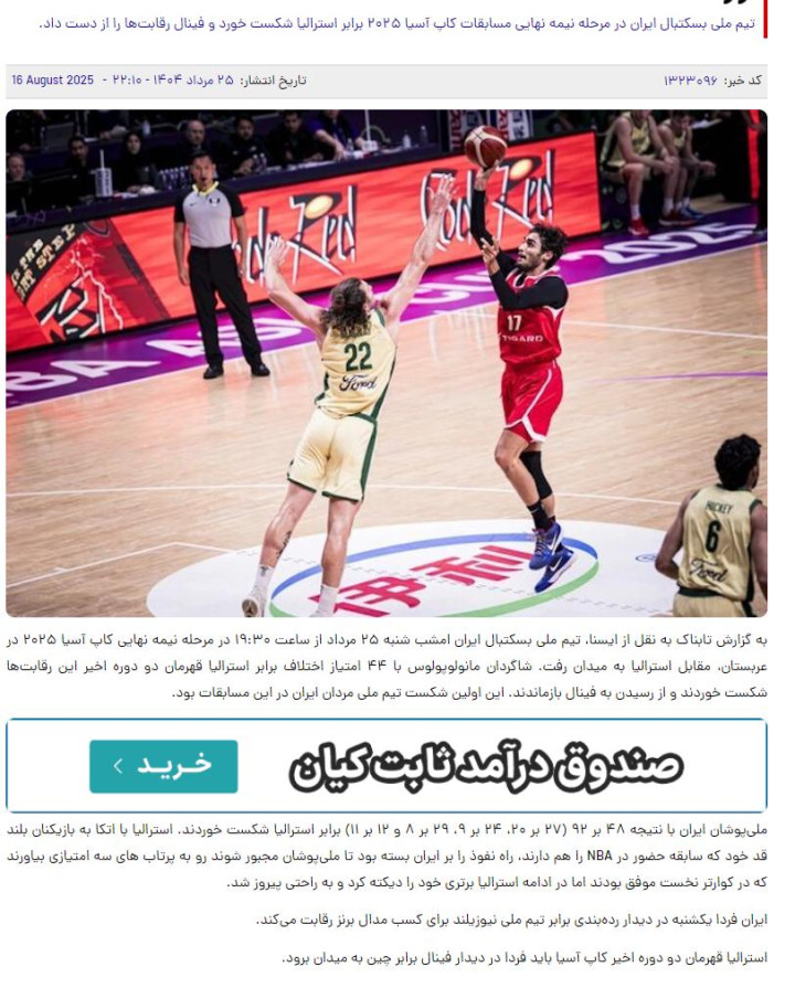 赛后伊朗媒体《Tabnak》发文——伊朗男篮在半决赛中44分惨败澳大利亚无缘决赛,伊朗将与新西兰竞争铜牌。
