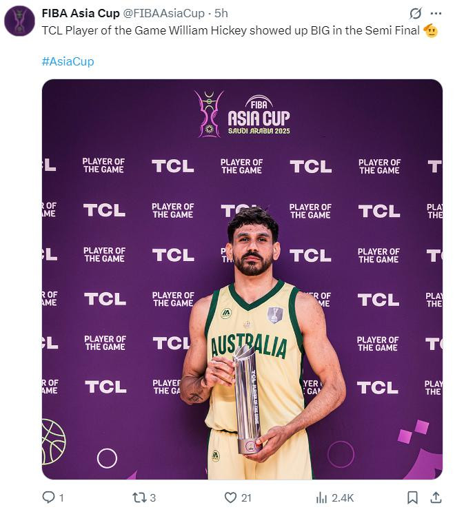 这场比赛官方将MVP颁发给了26岁的锋线威廉-希基,他全场比赛替补登场15分钟,9中5,罚球5中4拿到14分6篮板6助攻0失误,正负值+27,他的表现很全面。实际上澳大利亚全队4人上双,上双的每个球员都是MVP级别的表现。