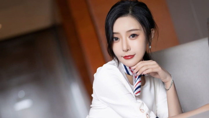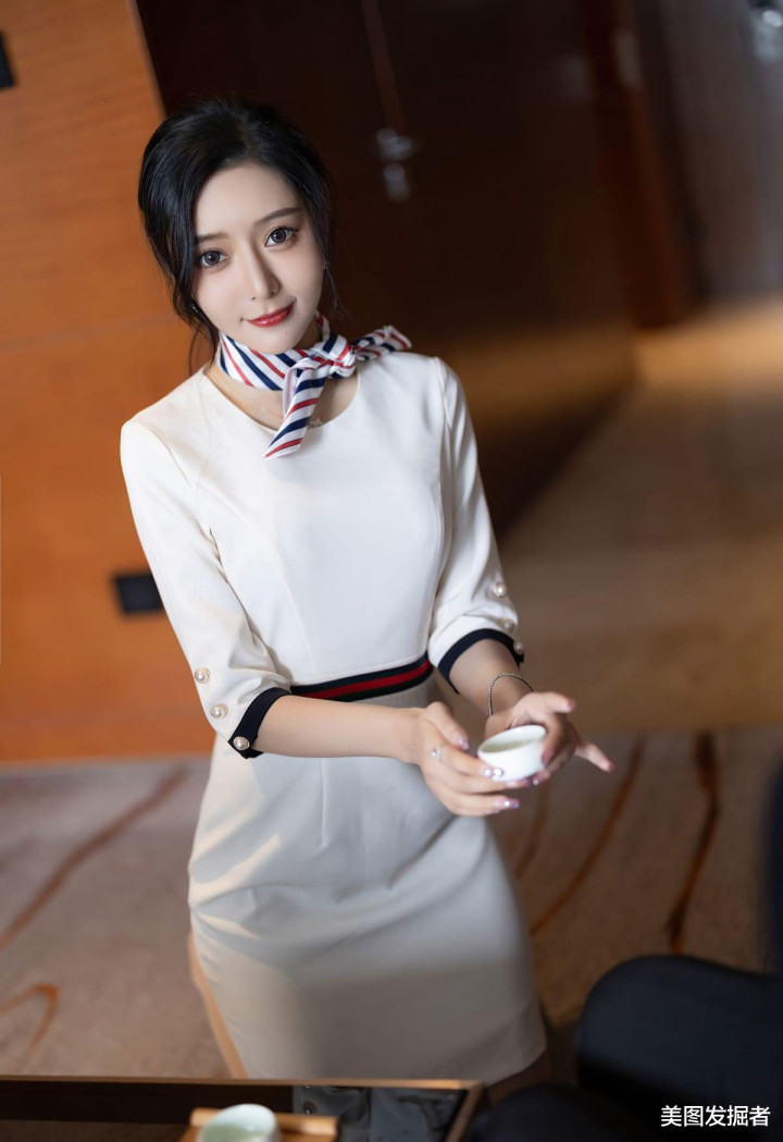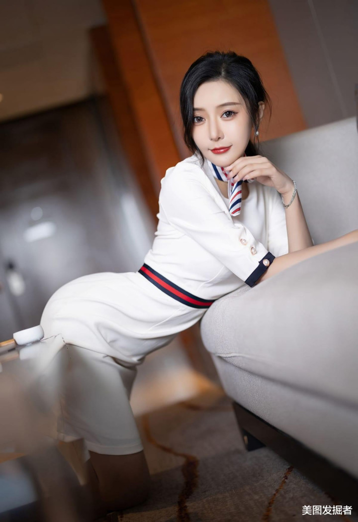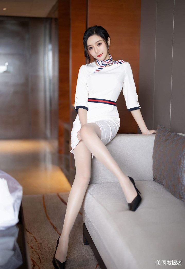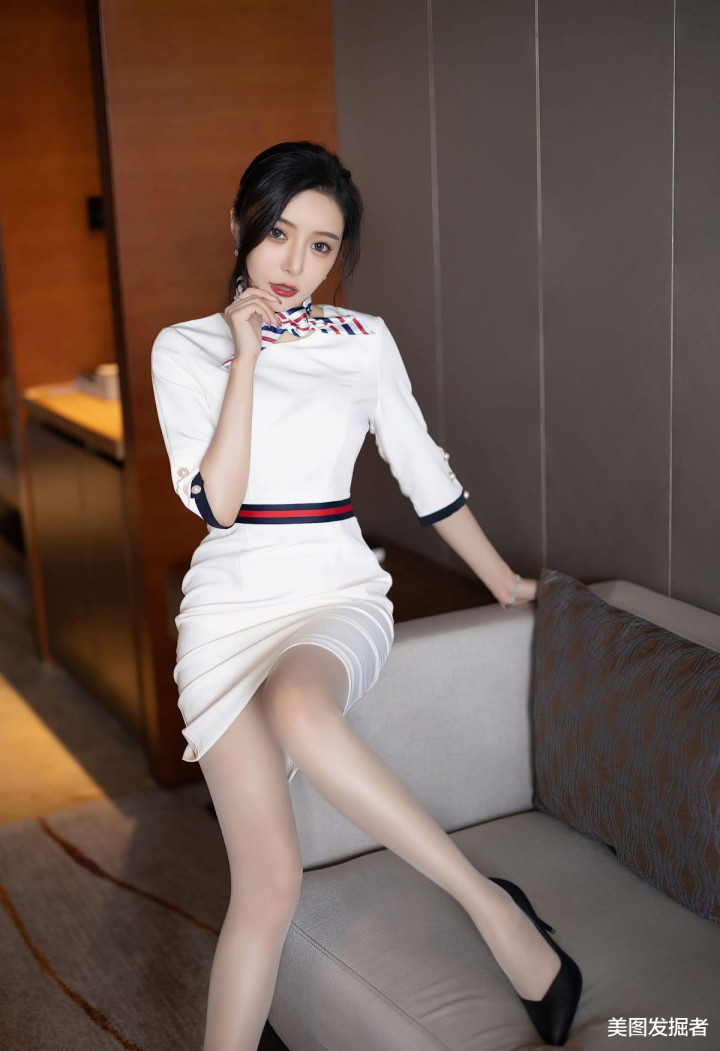 白色制服裙勾勒S曲线,领口红蓝条纹领巾俏皮减龄,腰部褶饰设计凸显腰线,肉色丝袜包裹着笔直美腿,搭配黑色高跟鞋,既有职业女性的利落干练,又不失女性的性感妩媚,举手投足间散发致命吸引力。