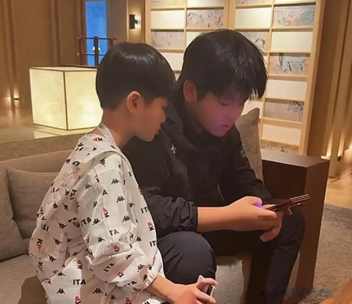 杨子用手指着小哥俩,安迪正在和弟弟一起看手机,他手里拿的是上万元的折叠机,日常生活倒是没被亏待,就是性格太内向了。