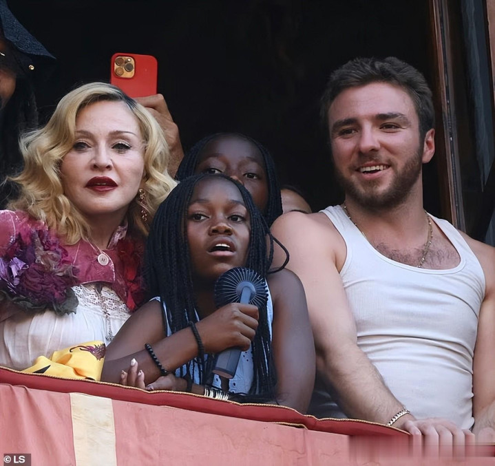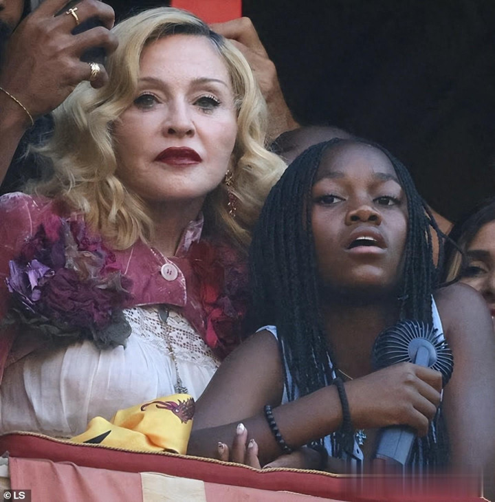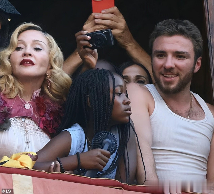 麦当娜和孩子们站在站台的位置,哪怕当天的气温来到了35度,一点没有减少他们看比赛的热情。麦当娜12岁的养女手里拿着一只黑色的手持小风扇,不停地吹风。