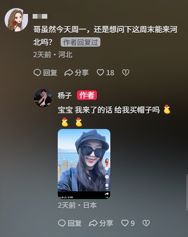 一开始,杨子还能把握点尺度,有女网友调侃他,让他周末来河北玩。杨子笑嘻嘻回答:宝宝,我来了的话,给我买帽子吗?