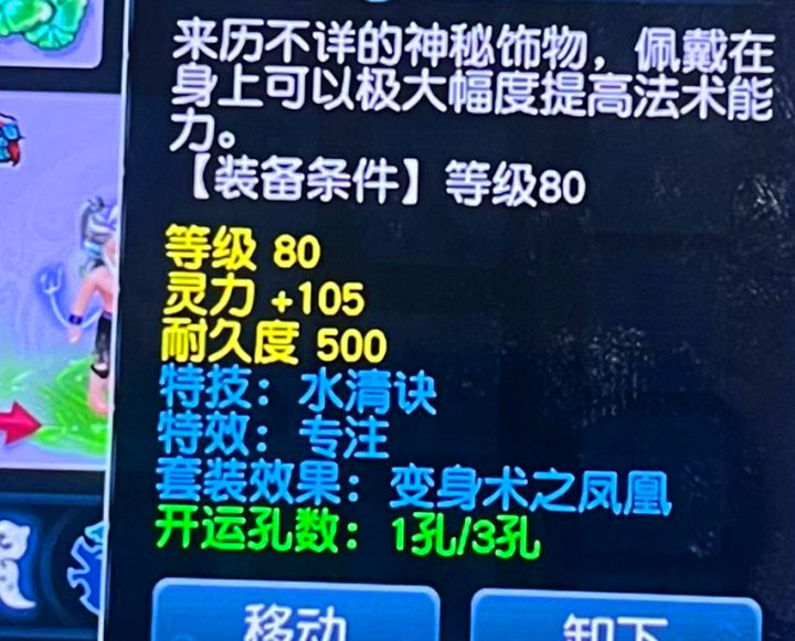 上面这位玩家现在有一条80级专注水清决的链子,然后这位玩家点化出来了凤凰的套装变身树枝。凤凰套也是可以增加敏捷属性的,只不过增加的敏捷属性不多罢了。上面的这位玩家现在也算是一发入魂了,专注和水清决的叠加在任务系统中对于固伤来说比较重要。点化出敏捷套以后可以卖到一个比较高的价格,现在就可以等着那些固伤过来开价了。