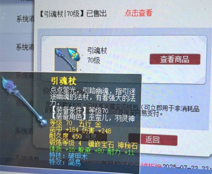 上面这把70级的武器是上面的这位玩家在抓鬼任务中获得的,上面的这把武器拥有着简易和破甲术两个蓝字效果,现在这位玩家打了四级宝石以后上架了藏宝阁。令上面这位玩家没想到的是自己已经往高了摆了,摆了600块钱还是在上架藏宝阁后的20分钟内被别人给买走了。是上面这位玩家摆的价格低被别人给捡漏了,还是上面这位玩家刚好碰到了有需求的人。小编感觉应该是后者吧,因为上面这把武器的价值也就是这么高。