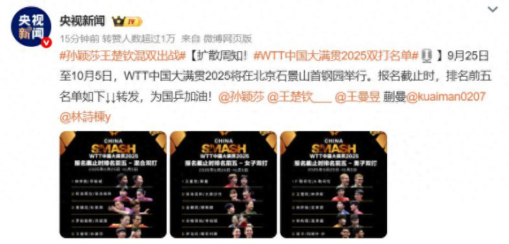 2025年WTT中国大满贯赛将于9月25日至10月5日在北京石景山首钢园区举行,这项赛事是世界乒联最高级别的赛事之一,冠军积分高达2000分,等同于奥运会和世乒赛的积分标准,世界乒联于8月27日正式公布了双打参赛名单,其中最引人注目的是中国队的王楚钦将身兼三项,男单、男双(与林诗栋搭档)和混双(与孙颖莎搭档)