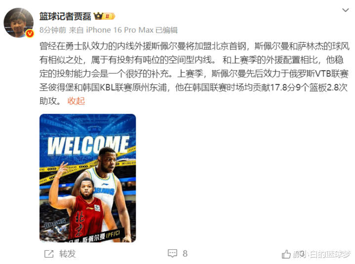 北京时间8月29日,篮球记者贾磊爆料,曾经效力金州勇士队的斯佩尔曼将加盟北京难受。斯佩尔曼与萨林杰的能力相似,都是有投射有吨位的空间型内线,上赛季他先后在俄罗斯联赛、韩国KBL联赛打球。