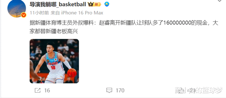 根据媒体人的爆料,赵睿离开新疆让球队获得了高达1.6亿的转会费,北京是花了大价钱才得到赵睿。
