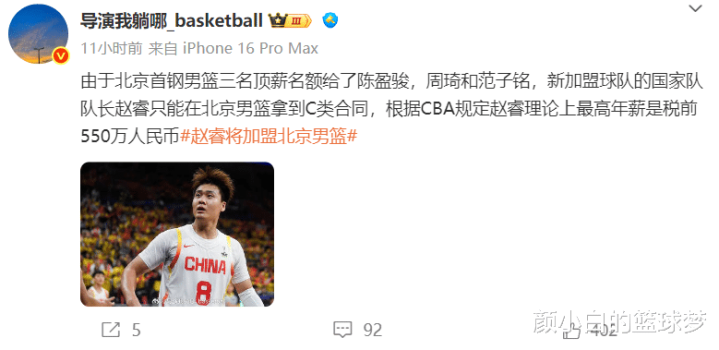 而且赵睿大概率是跟北京签下C类合同,因为北京已经有周琦、陈盈骏、范子铭三个D类顶薪,赵睿的C类合同税前最高的550万人民币。