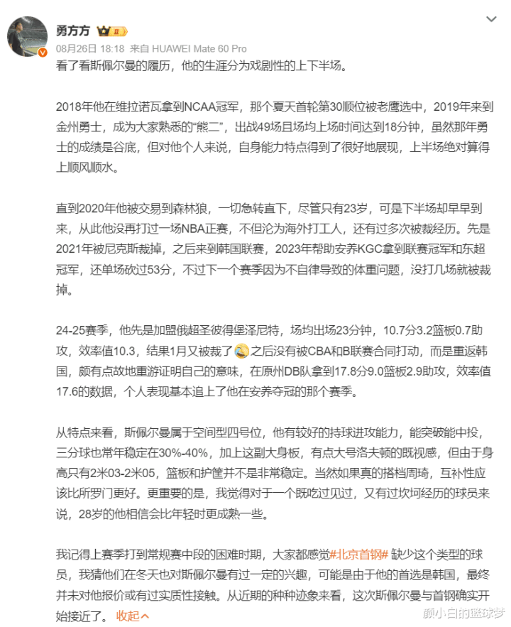 三天之前北京记者勇方方就透露过,斯佩尔曼接近签约北京,而且他还详细的分析了北京想要签下他的理由:
