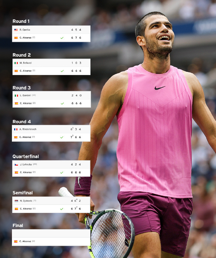 在北京时间9月6日结束的美网男单首场半决赛中,22岁的阿尔卡拉斯直落3盘横扫38岁的老将德约科维奇,强势晋级美网决赛。美网开赛至今,阿尔卡拉斯状态火爆,6场比赛全是3-0取胜,至今没有丢过1盘,可谓冠军相十足。
