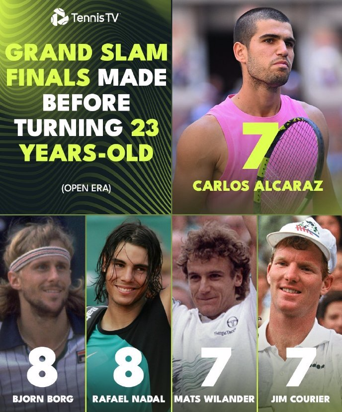 第5,阿尔卡拉斯已经7次打进大满贯决赛,22岁111天的他是公开赛年代达成这一成就第三年轻球员,仅次于纳达尔和比约-博格。