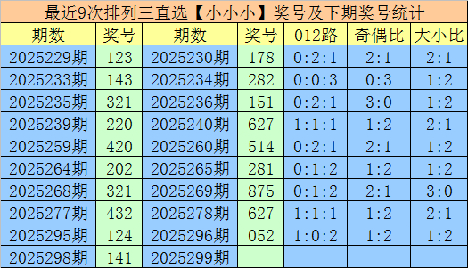 上期回顾:排列三第2025298期奖号为141,组三,大小比开出0:3,直选分布为:小小小。
