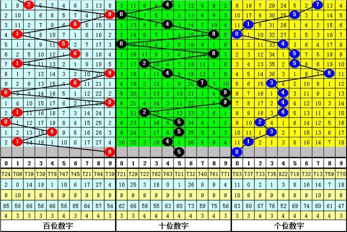 3.在以上9期奖号中,号码012路比分别开出0:2:1、0:0:3、0:2:1、1:1:1、0:2:1、0:1:2、0:1:2、1:1:1、1:0:2,012路出现个数比为3:10:14,本期预计开出012路比2:0:1。